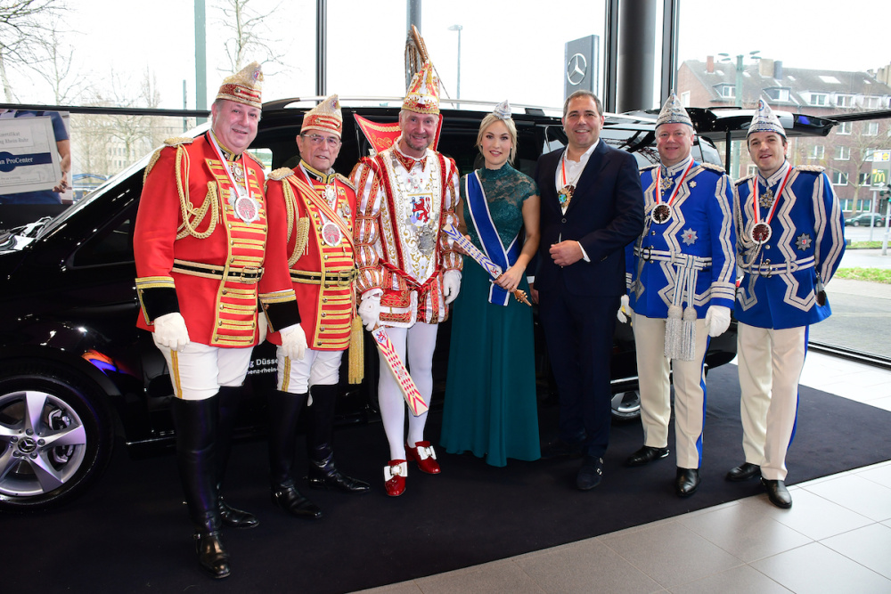 Der erste Termin im neuen Jahr ist nicht nur für Prinz Axel I. und Venetia Jula etwas Besonderes, sondern auch für Michael Eßer, den Leiter der Mercedes- Benz Niederlassung Düsseldorf und Verkaufsleiter PKW für die Niederlassung Rhein-Ruhr. „Ich freue mich sehr, dass wir auch in diesem Jahr das Prinzenpaar und sein Gefolge mit unseren Fahrzeugen unterstützen können“, betonte Eßer im Beisein von CC-Präsident Michael Laumen und CC-Geschäftsführer Hans- Jürgen Tüllmann anlässlich der offiziellen Übergabe der Fahrzeuge in der Mer- cedes-Benz Niederlassung Düsseldorf. Zum ersten Mal wird das Prinzenpaar auf Wunsch des CC gemeinsam in einer S-Klasse den Auftrittsmarathon der fünften Jahreszeit absolvieren. Wie Michael Eßer betonte, handele es sich dabei zum ersten Mal um das besonders umweltfreundliche Modell S 560 e, einen Hybrid der neuesten Generation mit langem Radstand und allem erdenklichen Komfort.