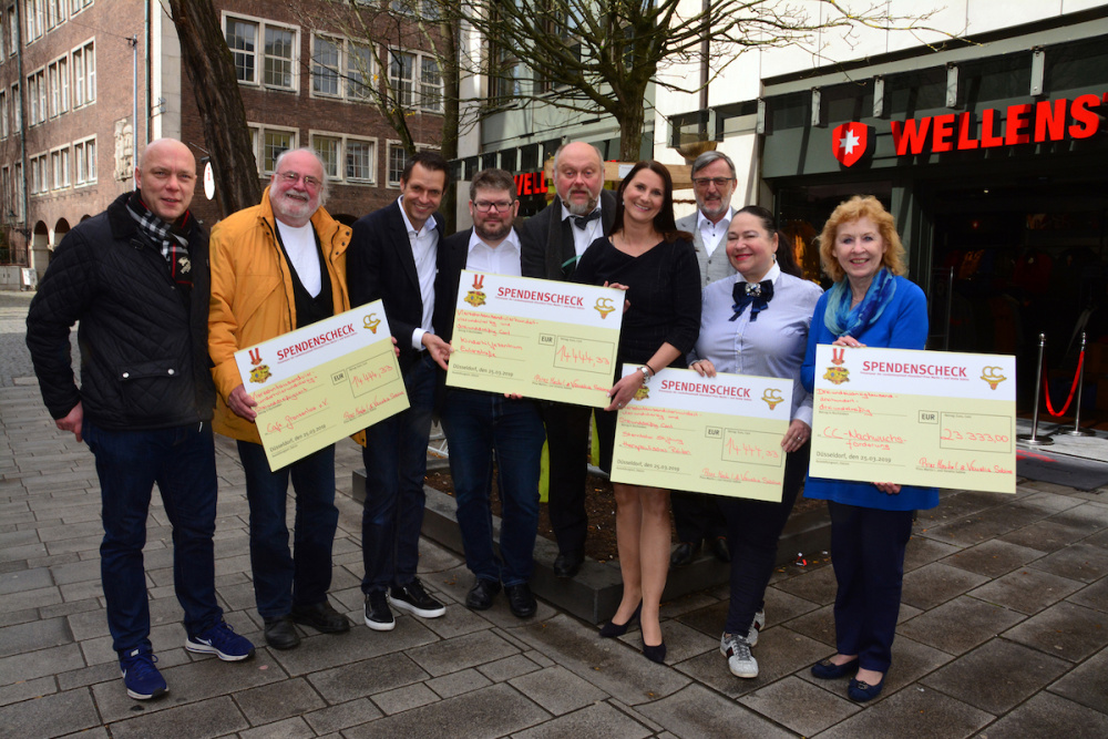 So schnell war noch kein Prinzenpaar: Auf den Tag genau 3 Wochen nach Rosenmontag verteilten Martin Meyer und Sabine Ilbertz die während ihrer Regentschaft gesammelten Spenden an die von ihnen gewählten Institutionen. Im Rahmen einer Pressekonferenz in der Hausbrauerei Uerige, an der auch CC-Präsident Michael Laumen teilnahm, wiesen die Tollitäten der Session 2018/2019 darauf hin, dass durch Geldspenden und den Spendenpin-Verkauf exakt 46.666,66 Euro gesammelt worden seien. Dankenswerterweise habe die Stiftung „It’s for Kids“ diesen Betrag um 20.000 Euro aufgestockt, so dass nun insgesamt 66.666,66 ausgeschüttet werden können. 23.333 Euro fließen an die CC-Nachwuchsförderung, jeweils 14.444,33 an das Kinderhilfezentrum Eulerstraße, die Stiftung Sterntaler und das Café Grenzenlos. Das Prinzenpaar nutzte ebenso wie der CC-Präsident die Gelegenheit, um nicht nur allen Spendern, sondern auch den zahlreich anwesenden Pressevertretern für die umfangreiche Berichterstattung und die mediale Begleitung während der Session zu danken. Martin Meyer und Sabine Ilbertz sprachen von einer tollen Zusammenarbeit und betonten, dass sie mittlerweile wieder problemlos im normalen Leben angekommen seien. Überreicht wurden die symbolischen Schecks anschließend vor dem Kugelahorn in der Altstadt, den das Prinzenpaar im Januar gepflanzt hatte.
